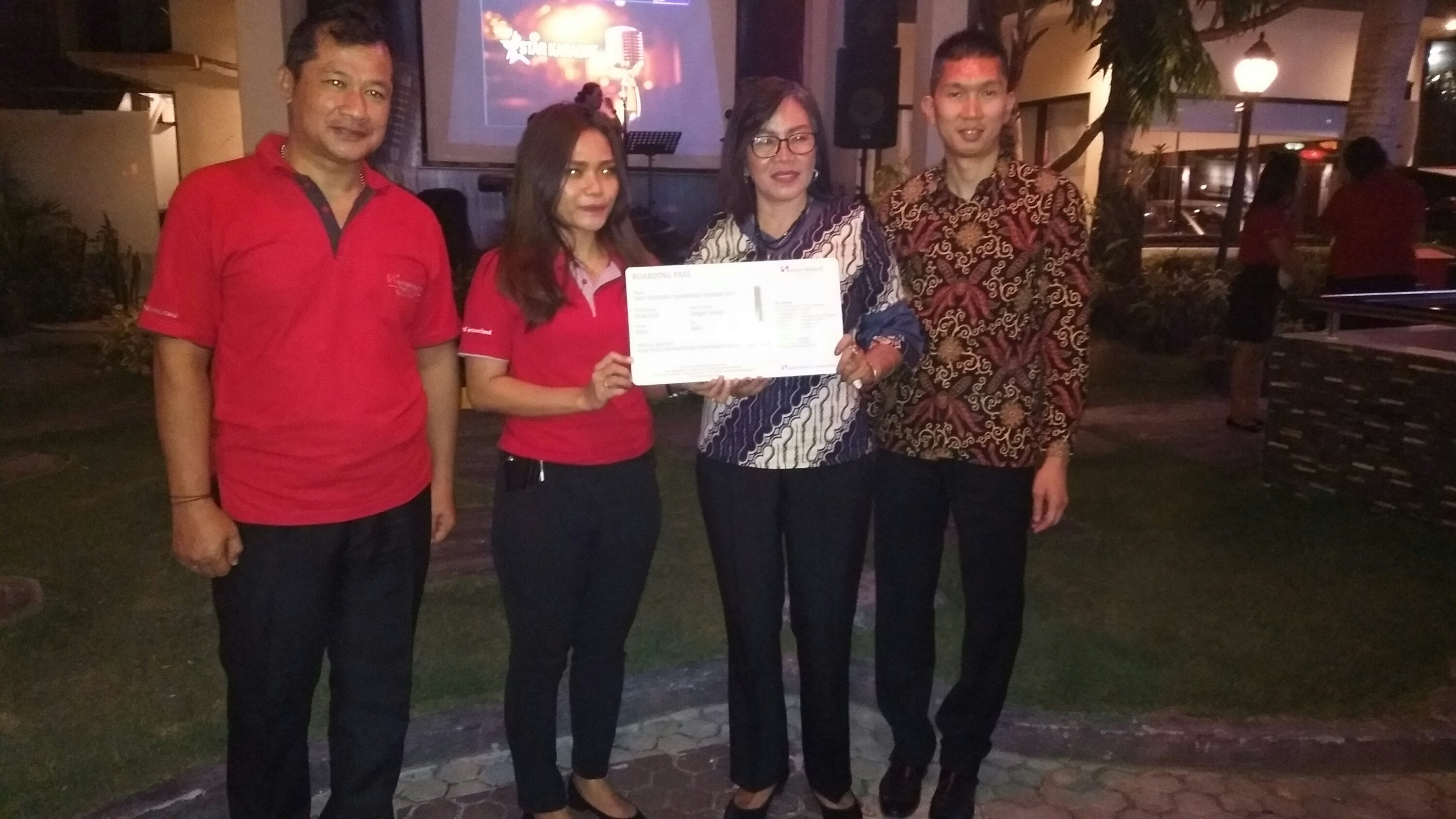 Manajemen swissbell hotel silae memberikan voucher jalan-jalan gratis ke kota bali berupa tiket pesawat PP. Sebagai apresiasinya kepada pelanggan yang melakukan pernikahan di hotel ini. (fhoto:nila)