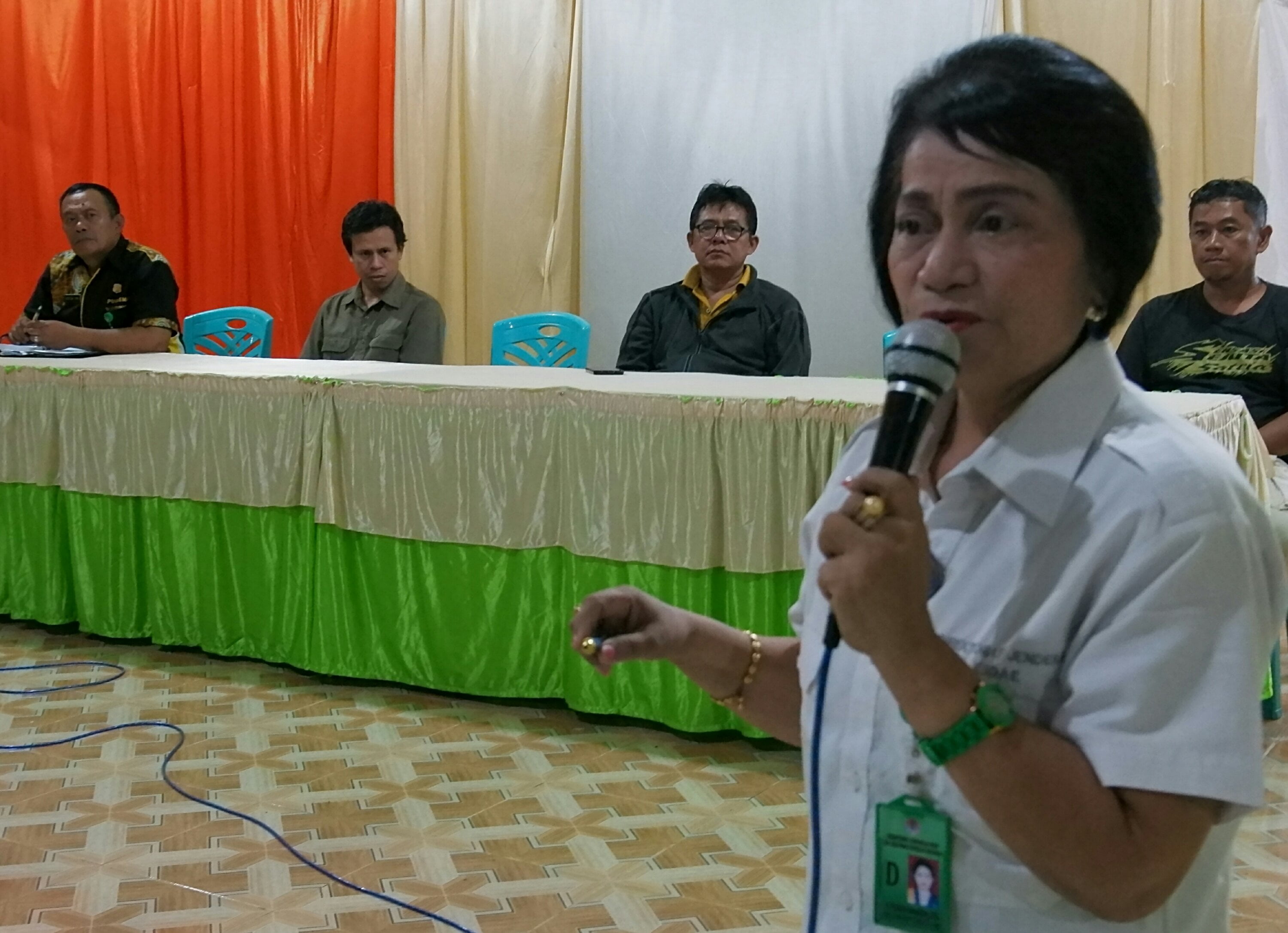 Mewakili Kepala Balai Besar Taman Nasional Lore Lindu (BBTNLL), Ir. Periskila Sampeliling, MSi mengajak para kades untuk berpartisipasi dalam memberantas penularan penyakit schistosomiasis, pada rapat di balai desa Tuare, Kecamatan Lore Barat, kabupaten Poso.(foto:nila)
