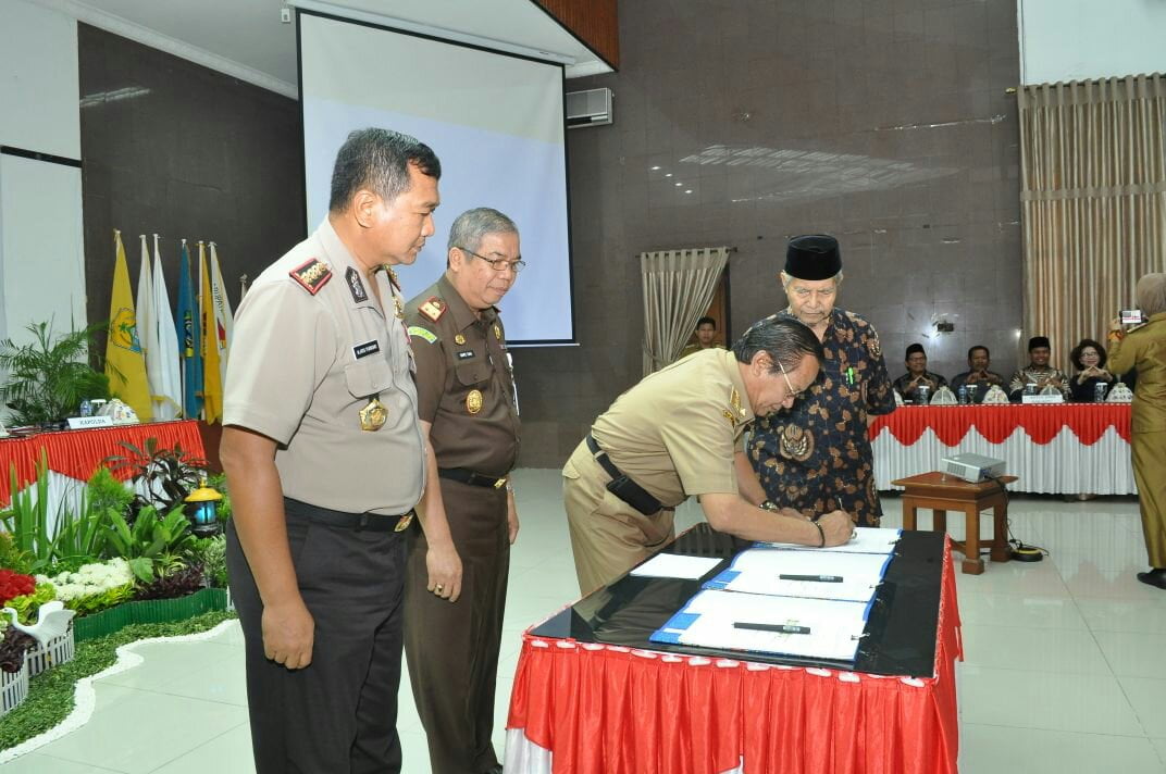 Gubernur Sulteng, H. Longki Djanggola, Kapolda Sulteng diwakili Kombes. Pol. Moh. Aris Purnomo selaku Wakapolda Sulteng dan Kajati Sulteng, Sampe Tuah saat menandatangani perjanjian kerjasama APIP dan APH, dalam rangka mewujudkan Sulteng zero korupsi. (foto:nila)