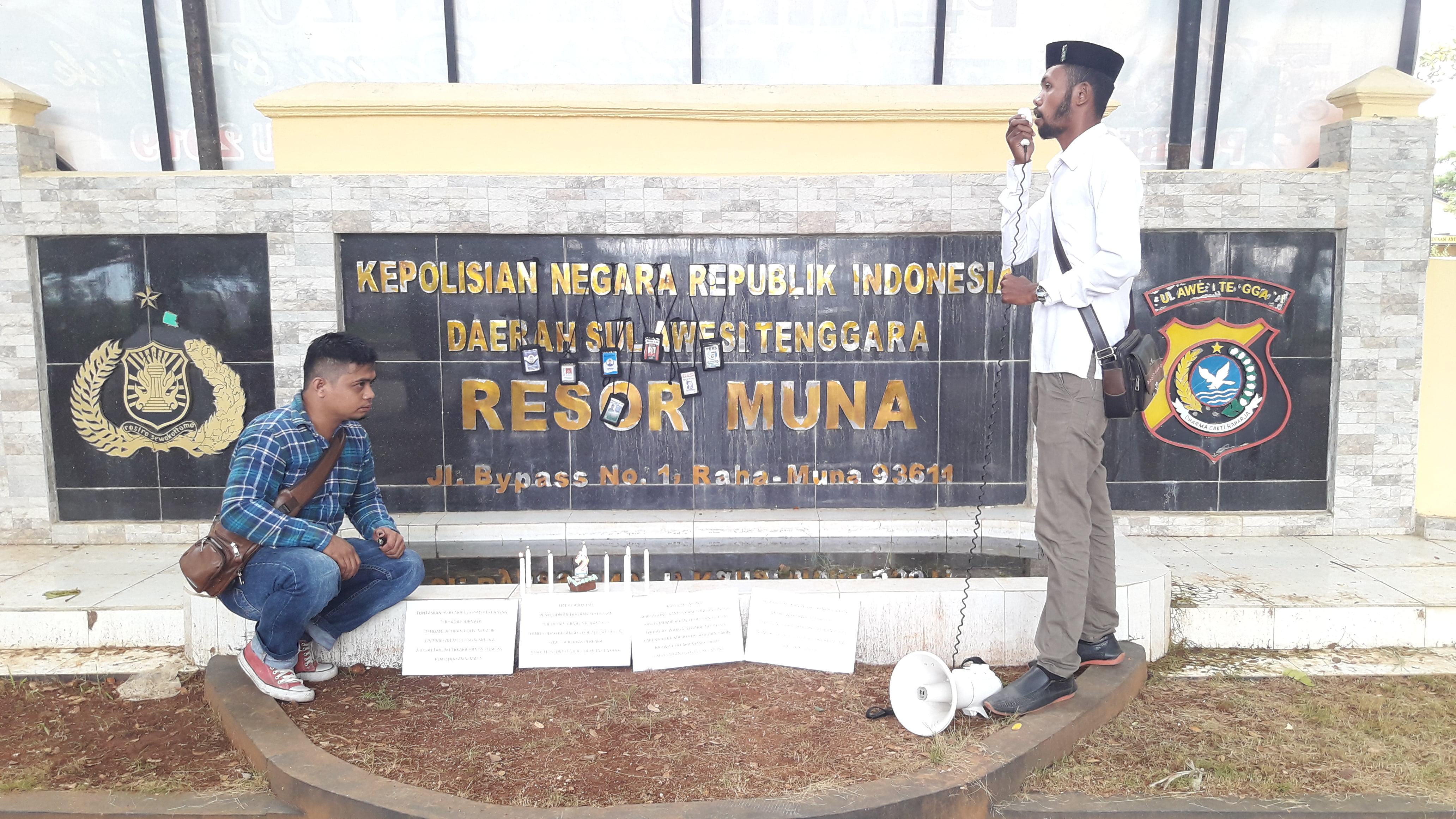 Aksi Demo ini dilangsungkan dengan membakar lilin ulang tahun, pas yang ke-2 tahunnya dengan menggantung ID Card Jurnalis di Papan Kantor Mako Polres Muna rabu (27/3/2019), sebagai bentuk teaterikal pengharapan Polres Muna bisa melindungi kebebasan pers.