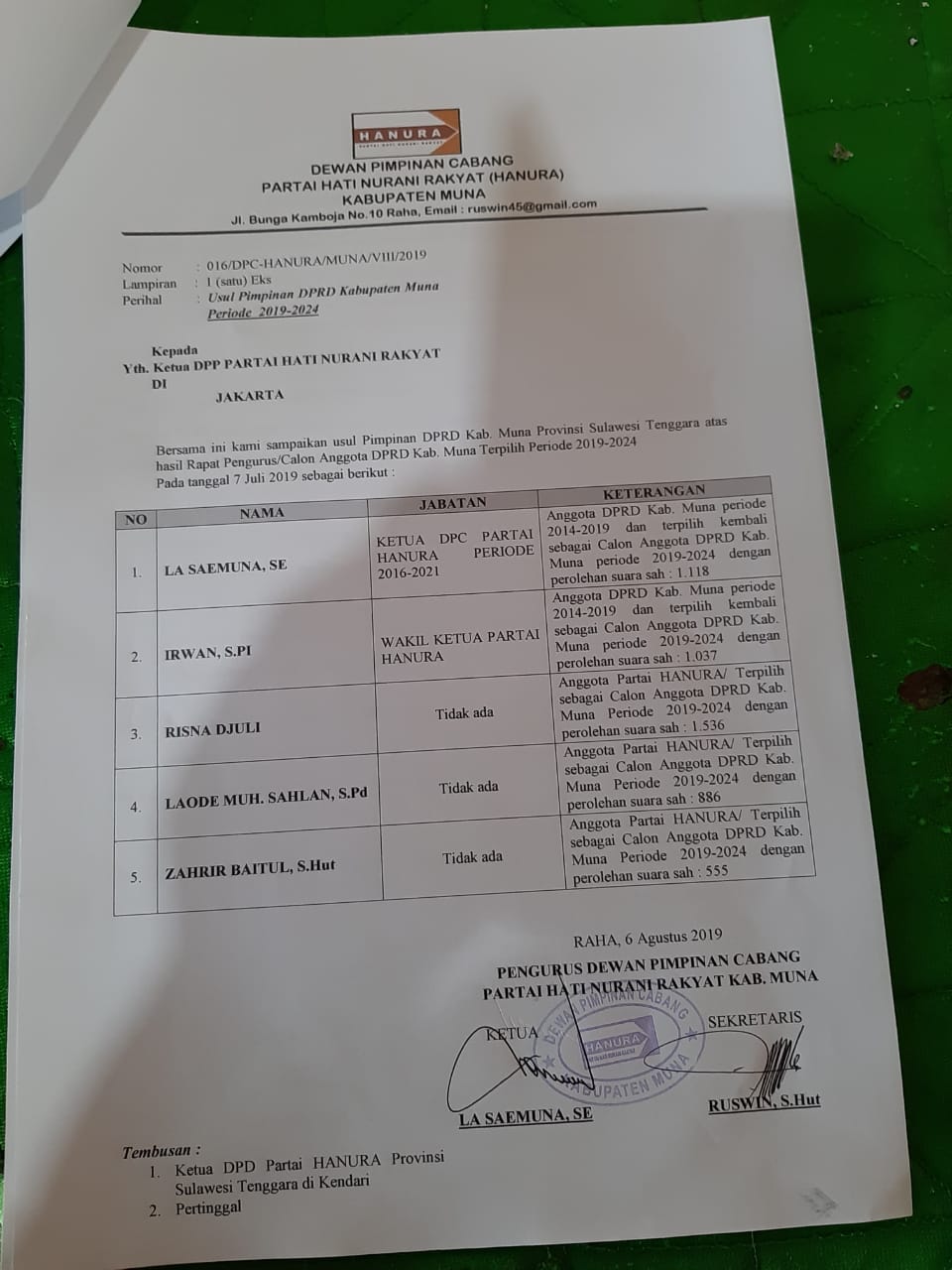 Partai Hanura sudah memberikan usul melalui surat DPC yang dilayangkan ke DPP tertanggal 6 agustus 2019, dan saya sebagai ketua Bapilu DPC Partai Hanura Kabupaten Muna memberikan usul ke DPP, agar jabatan sebagai ketua DPRD, mesti diberikan kepada orang yang sudah berjasa membesarkan Partai dan berkorban demi kemajuan partai yaitu pengurus inti DPC Kabupaten Muna, tutupnya.