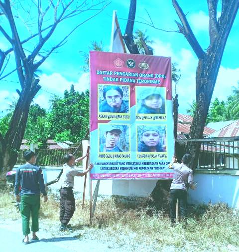 Poso, Portalsulawesi.id- Untuk mempermudah warga mengenali wajah empat orang Terduga DPO Terorisme di Poso, Polri kembali memasang sejumlah baliho yang memuat Foto ke empat wajah Terduga Terorisme Poso yang belum tertangkap.